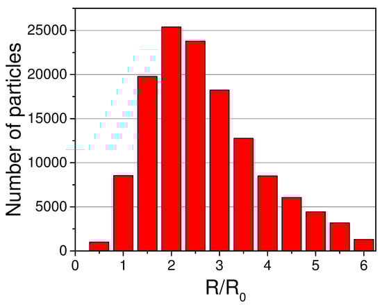 We implemented the algorithm using C++ programming language to solve Equation (9). For all simulations, a standard personal computer was used. We chose Fe as particles’ material and used sample parameters similar to in the experiment (see Section 4). Particles had radius  of 5 m. Young’s modulus  of elastomer matrix was varied from 0.01 GPa to 1 GPa. We did not use any periodical approximations and simulated sample as whole using 25,000–130,000 particles in each simulation. Volume concentration of metallic particles was varied up to 27%.