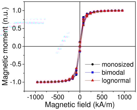 Simulated field dependence of magnetization of magnetorheological elastomers (MRE) with different types of size distribution of filler particles. Simulation was performed for a sample with 8.1% volume concentration of Fe.