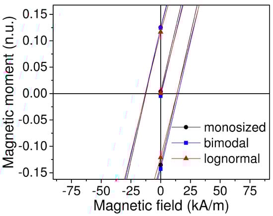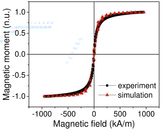 First, we simulated magnetic properties of the material, particularly the magnetic field dependence of magnetization. Simulation results show that we obtained the same magnetic hysteresis for different types of particle size distribution—monosized, bimodal and lognormal (Figure 6). In addition, the simulation showed the presence of coercive field for all three types of MRE (Figure 7). The simulated field dependence matcheed well with the experimental results. Figure 8 shows the comparison of magnetic hysteresis curves obtained using our model and measured with vibrating sample magnetometer (VSM). For magnetization measurements with VSM, sample was attached to the holder with Teflon tape. We assumed that a minor change of sample shape would not affect demagnetization factor significantly and thus neglected it.