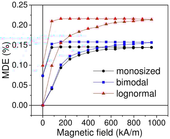 The simulated field dependences of MDE in magnetic elastomers with three types of particles size distribution are shown in Figure 9. All three types of samples show the same qualitative behavior, hence they are different in the maximum MDE value, with lognormal distribution being the largest one.