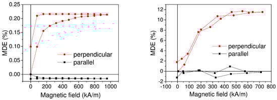 We compared simulation results for dependence of MDE on external magnetic field with experimental data reported in [] and obtained for Fe-based MRE (Section 4). Comparison showed that the developed model described the effect qualitatively well (Figure 10).