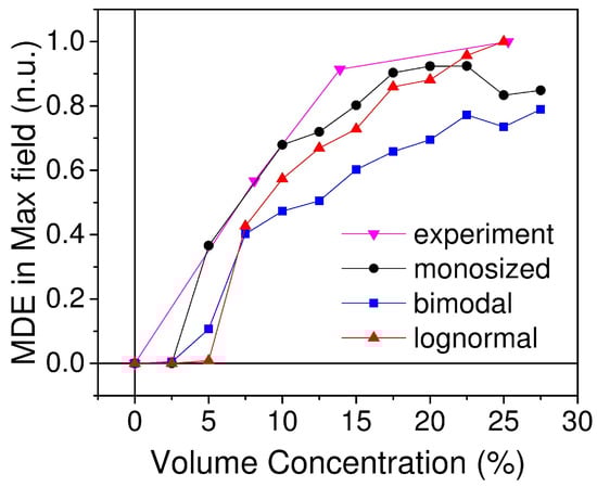 MRE exhibit strong dependence of MDE on the magnetic particles mass/volume concentration. We performed series of simulations calculating the maximum value of MDE for varied value of the filler volume concentration for three types of particles size distribution. Simulations results were compared with experimental data obtained for samples described above (Figure 11). Mass fractions were recalculated to volume fraction. All three types of size distribution showed the same trend as experimental data. The lognormal type had the largest saturation value of MDE. For the small volume concentration, the lognormal distribution showed smaller MDE value in comparison with the other two types, and started to grow at higher concentration of magnetic filler. In the case of lognormal size distribution, there were fewer particles than for monosized sample due to the presence of larger particles. Since for low concentration the average distance between particles was large, the small number of particles played a significant role and led to the smaller value of effect.