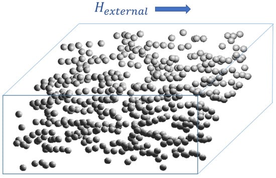 It is widely reported [,,] that particles tend to form chain-like structures inside the MRE when external magnetic field is applied. We used GTK open library to visualize particles positions throughout the simulation. Visualization of aligned chains of particles inside the matrix in maximal magnetic field for monosized distribution is shown in Figure 12 and in Supplementary Videos.