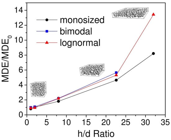 We performed a series of simulations to obtain the dependence of MDE on the sample shape. We changed width/thickness ratio of the MRE sample and calculated maximum MDE value for each case. Volume concentration of magnetic filler was fixed and equal to 27%. Volume of the sample was also fixed. The simulation showed the increase in the effect for the thinner samples. For lognormal type of size distribution, the increase was up to 1400% for ratio = 32 compared to ratio = 1 (Figure 13). This may be explained by the chains formed by particles being shorter, which led to increasing influence of the single particle displacement in the chain. Presence of big particles for lognormal type led to almost two times greater value of MDE than for monosized system. Significant increase of MDE value for thin MRE samples might be of high interest for applications in flexible electronics [].