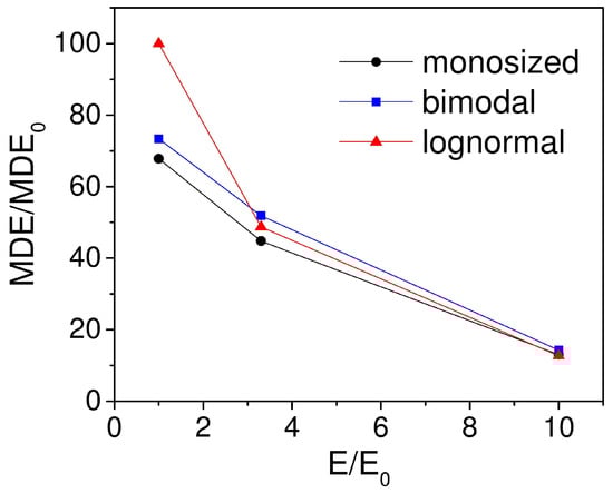 In addition, simulations showed the decrease of the effect magnitude with the increasing Young’s modulus of samples (Figure 14). All simulations were performed for cubic-shaped systems with volume concentration of 27%. Again, the lognormal distribution type showed the largest value for softer matrices, which was related to the presence of bigger particles in such distribution type. They created larger local magnetic fields and provided higher mobility, which led to larger MDE value among all three types of size distributions.