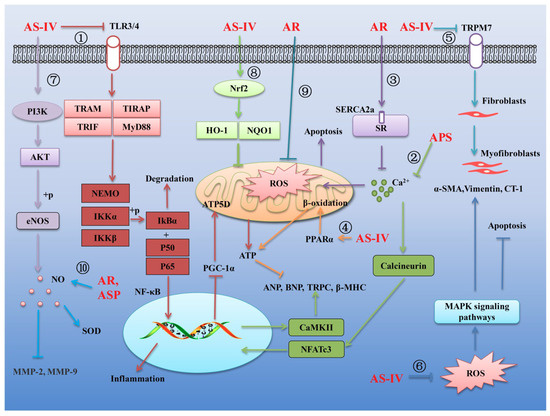 Myocardial hypertrophy is usually considered as a compensatory response to pathological conditions [64]. Long-term hypertrophy can lead to myocardial inflammation, myocardial metabolic disorders, abnormal energy production of myocardial cells, myocardial ischemia and hypoxia, heart failure and sudden death [64]. It is well known that nuclear factor κB (NF-κB) is a family of transcription factors, which have an effect on regulation of inflammatory response [65,66,67,68]. Growing evidence suggests that activation of Toll-like receptor 4 (TLR4) receptor can activate its downstream NF-κB signaling pathway, thereby promoting the production of inflammatory factors in damaged myocardium cells. It was reported that AS-IV could attenuate inflammatory cytokines by inhibiting TLR4/NF-κB signaling pathway in isoproterenol-induced myocardial hypertrophy in rats [69] (Figure 1①). On the other hand, dysfunction of cardiac energy biosynthesis contributes to the hypertrophy and NF-κB/Peroxisome Proliferator-activated Receptor-γ Coactivator 1α (PGC-1α) signaling gets involved in the dysfunction. The results from another study showed that AS-IV could protect against isoproterenol-induced cardiac hypertrophy through regulating NF-κB/PGC-1α signaling mediated energy biosynthesis [70] (Figure 1①). Moreover, it is known that calcium homeostasis plays an important role in the progression of myocardial hypertrophy. When cardiac hypertrophy occurs, overload calcium can activate its downstream calcineurin and promote the nuclear factor of activated T cells cytoplasmic 3 (NFATc3) transcription factor into the nucleus, then activate calmodulin II kinase (CaMKII) and promote the expression of cardiac hypertrophy indicators. It was found that APS could alleviate the augment of intracellular free calcium during cardiac hypertrophy induced by isoproterenol. The upregulated expression of calcineurin, translocation of nuclear factor of activated T cells, NFATc3 into nucleus and activation of CaMKII (reflected by p-CaMKII) were suppressed by the application of APS. These results revealed that APS can exert its anti-hypertrophic action via inhibiting Ca2+-mediated calcineurin/NFATc3 and CaMKII signaling cascades in isoproterenol-induced cardiac hypertrophy rats [71] (Figure 1②).