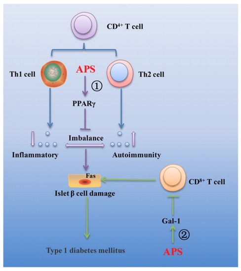 T1DM is an autoimmune disease characterized by the destruction of insulin-producing beta cells in the pancreas and the absolute insufficiency of insulin secretion [83]. T lymphocyte (T cell) mediated immune response plays an important role in the pathogenesis of T1DM. The main functional subgroups of T cell include CD4 + T cells and CD8 + T cells. Under normal physiological conditions, CD4 + T cells and CD8 + T cells maintain a dynamic balance of CD4 +/CD8 + and keep a normal immune response in the body. Under the stimulation by antigens, the CD4 + T cells differentiate into Th1 and Th2 cells. Those cytokines secreted by Th1 cells include IL-1, IL-2, IL-6, IL-12, TNF-α and INF-γ, which can mediate the cellular immunity and cause damage to islet beta cells. Those cytokines secreted by Th2 cells include IL-4, IL-5, IL-6, IL-10, IL-13 and TGF-β, which can mediate fluid immunity and protect the islet beta cells. Th1 and Th2 cytokines together play important roles in immune regulation [84]. In clinics, APS has been widely used as an immunosuppressive agent. Substantial evidence exists that APS could downregulate blood glucose level, upregulate serum insulin concentration, increased beta cell mass and decrease apoptotic beta cell percentage, resulting in the downregulation of Th1/Th2 cytokine ratio and upregulation of PPARγ gene expression in spleens of streptozotocin-induced T1DM mice [85,86,87]. In addition, it was also demonstrated the effects of APS on the prevention of T1DM by correcting the imbalance between the Th1/Th2 cytokines on non-obese diabetic (NOD) mice [88] (Figure 2①). Furthermore, it is known that galectin-1 (gal-1) is closely related to T cell activation and apoptosis. It was found that APS could up-regulate the expression of galectin-1 in muscle of streptozotocin-induced T1DM mice, resulting in the apoptosis of CD8 + T cells, which may be an important mechanism by which APS protects β cells of the pancreatic islets from apoptosis induced by CD8 + T cells in T1DM in vivo [89] (Figure 2②).