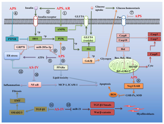 High glucose-induced inflammation, renal microangiopathy, renal injury and fibrosis are the main characteristics of diabetic nephropathy, which is the leading cause of the end-stage failure of the kidney. NF-κB, an activation of the transcription factor, has been suggested to be a key step in the pathogenesis of diabetic nephropathy. Under physiological conditions, NF-κB is bound with an inhibitory protein of nuclear factor-κB (IκB) to form as an inactive transcription factor in the cytoplasm. After exposure to various stimuli, such as oxidative stress, angiotensins and various cytokines, NF-κB is released rapidly from IκB and then activate the gene expression of several cytokines, chemotactic and matrix proteins involved in inflammation, immunological responses and/or proliferation, which may contribute to the accumulation of renal extracellular matrix and tubulointerstitial fibrosis, resulting in kidney damage [112]. APS was proven to inhibit the expression of inflammatory factors and alleviate diabetic nephropathy by inhibiting the NF-κB signaling pathway in streptozotocin-induced diabetic nephropathy rats [113,114] (Figure 3⑩). In addition, evidence exists that epithelial-mesenchymal transition (EMT) and transforming growth factor (TGF)-β1 play important roles in renal fibrosis. Over-expression of TGF-β1 can promote the expression of its downstream SMAD and then promote the EMT process, thereby promoting renal fibrosis in patients with diabetic nephropathy. It was reported that AS-IV can delay the renal fibrosis process in diabetic KKAy mice by influencing the TGF-β/SMADS signaling pathway and down-regulating TGF-β1, SMAD2/3 and inhibiting the EMT process [115] (Figure 3⑪). Besides, endoplasmic reticulum (ER) stress also plays an important role in the pathogenesis of diabetic nephropathy. The data from a study indicated that AS-IV reduced the ER stress to decrease proteinuria and attenuate diabetes in streptozotocin-induced diabetic rats, which might be an important mechanism in the renoprotective function of AS-IV in the pathogenesis of diabetic nephropathy [116] (Figure 3⑫). What is more, growing evidence suggests that the Wnt/β-catenin pathway and the TGF-β1/Smads pathway are closely linked to the process of cell injury. Overexpression of microRNA-21 can activate the Wnt/β-catenin pathway and TGF-β1/Smads pathway and promote renal injury and fibrosis. It was found that the overexpression of miR-21 activated the β-catenin pathway and the TGF-β1/Smads pathway in the process of podocyte dedifferentiation and mesangial cell activation, which could be abolished by AS-IV treatment. Additionally, AS-IV could also improve renal function and fibrosis in diabetic KK-Ay mice [117] (Figure 3⑬).