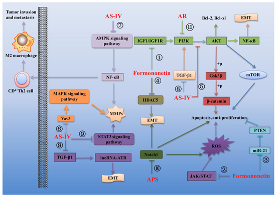 AR and its main components are widely used in the treatment of cancer and rehabilitation after operations in patients because of their characteristics of increasing curative effect and reducing the toxicity of chemotherapeutic drugs [11,118]. Substantial experiments have shown that AR and its main active ingredients have pharmacological effects such as inhibiting the proliferation and differentiation of cancer cells, inducing apoptosis of cancer cells, inhibiting invasion and migration of cancer cells, reducing drug resistance and enhancing immune function [15,119]. Growing evidence suggests that the main bioactive compounds responsible for the anti-cancer effects of AR mainly include formononetin, AS-IV and APS. Several mechanisms linking AR and its main components to the regulation of cancer are summarized in Figure 3.