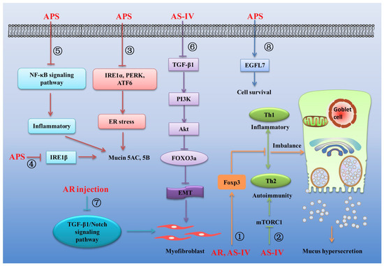 Asthma, a chronic airway inflammatory disease, is associated with a wide range of symptoms, including prolonged inflammation, airway hyperresponsiveness, mucus hypersecretion and airway remodeling [151]. Airway inflammation, one of the distinct characteristics of asthma, is directly linked to a T helper 2 (Th2)-associated disorder due to Th1/Th2 imbalance [152]. The imbalance of Th1 and Th2 cytokines can cause immune dysfunction, which can stimulate goblet cells to secrete excessive mucus in asthma [153]. CD4+ CD25+ regulatory T cells (Tregs) play a vital role in the regulation of immune function and their roles in asthma pathogenesis are increasingly recognized [154]. The forkhead family transcription factor Foxp3, which is predominantly expressed by CD4+CD25+ T cells, has been regarded as not only a faithful marker of Tregs but also a critical component for Treg development and function [154]. It was found that AR extract could significantly increase the population of CD4+CD25+Foxp3+ Treg cells, promote Foxp3+ mRNA expression, enhance Th2-mediated response and inhibit Th1-mediated response, thereby inhibiting the inflammation in a rat model of asthma, suggesting that the antiasthmatic effects of AR are at least partially associated with CD4+CD25+Foxp3+ Tregs [12] (Figure 5①). Another similar study showed that AS-IV also could attenuate allergic inflammation by regulation Th1/Th2 cytokine and enhancement CD4+CD25+Foxp3+ T cells in ovalbumin-induced asthma [155] (Figure 5①). Besides, previous studies revealed that the mTOR signaling pathway, a downstream signaling pathway of PI3K, is closely related to the proliferation and differentiation of T cells and plays an important role in the pathological process of asthma [156]. Inhibition of mTOR could attenuate key characteristics of allergic asthma, including airway inflammation, airway hyperreactivity and goblet cell metaplasia [157]. It was observed that AS-IV could significantly ameliorate airway inflammation by inhibiting the mTORC1 signaling pathway in an established murine model of asthma [158] (Figure 5②). ER stress, which can induce cell apoptosis by damaging DNA, also play an important role in the development of asthma. PERK (PKR-like ER kinase), IRE1α and -β (inositol-requiring transmembrane kinase/endonucleases) and ATF6 (activating transcription factor 6) are three classes of stress sensors expressed at the ER membrane and are closely involved in the production of ER stress [159]. IRE1β, a subtype of IRE1α, is related to the excessive secretion of mucin 5AC and 5B in the respiratory tract. It was found that APS can inhibit ER stress by inhibiting the expression of IRE1α, PERK and ATF6 [159] (Figure 5③) and decrease the expression of MUC5AC/MUC5B by inhibiting the expression of IRE1β in respiratory tract [160] (Figure 5④). Moreover, APS can inhibit the expression of inflammatory factors by inhibiting NF-κB signaling pathway [161] (Figure 5⑤). Thus, it was concluded that APS could effectively inhibit asthma by inhibiting ER stress and reduce the excessive secretion of respiratory mucus and respiratory inflammation in ovalbumin-induced severe asthma mice [162].