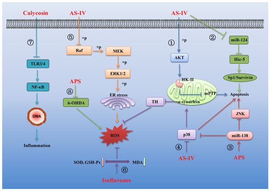 Parkinson’s disease (PD), an incurable progressive disease, is characterized by shaking, rigidity, slowness of movement and difficulty with walking [194]. Some antioxidants and anti-inflammatory drugs can relieve experimental Parkinson’s symptoms [195,196]. It is well known that NF-κB is a family of transcription factors, which have an effect on regulation of inflammatory response [65,66,67,68]. TLRs, a class of pattern recognition receptors, can regulate NF-κB and are involved in various inflammatory responses [197,198]. The expression levels of TLR2 and TLR4 significantly increased in the blood and brain of PD patients [199]. Besides, the MAPK pathway also plays a crucial role in the inflammatory response [200]. It was found that calycosin could attenuate 1-methyl-4-phenyl-1,2,3,6-tetrahydropyridine (MPTP)-induced PD by suppressing the activation of the TLR/NF-κB and MAPK pathways, indicating the potential drug of calycosin against PD [201] (Figure 6⑦). In addition, APS also have a very good therapeutic effect in the treatment of PD. It was confirmed that APS could attenuate MPTP-induced motor dysfunction, increase the proportion of TH-positive cells, reverse MPTP-induced mitochondrial structural damage and reduce MPTP-induced high levels of ROS and increase MPTP-induced decrease in mitochondrial membrane potential. Moreover, APS also decreased the bax/bcl2 ratio and cytochrome-c and caspase-3 protein expression in substantia nigra in a mouse PD model [202]. Similarity, APS was shown to have the protective effect against 6-hydroxydopamine (an oxidative metabolite of dopamine) induced PD, which is likely due to the alleviation of oxidative stress and regulation of the apoptosis pathway and cholinergic system [203] (Figure 6⑧).