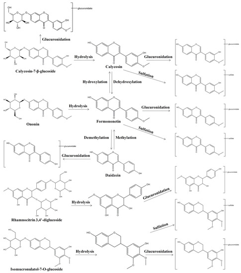Collectively, these studies demonstrated that isoflavonoids and saponins and their metabolites are the major type of constituents absorbed in plasma after oral administration of AR extracts. The metabolism and biotransformation were extensive after administration of AR extracts in vivo (Figure 7).