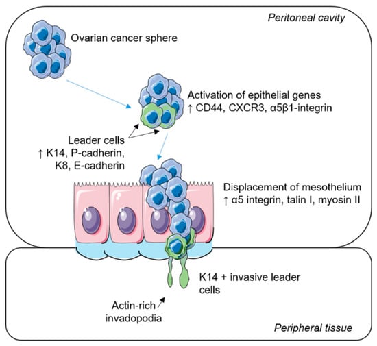 Local invasion of ovarian cancer cells to neighbouring tissues occurs by direct extension from the primary tumour; whereas dissemination to distal sites within the peritoneum occurs by passive movement of ovarian cancer spheres within the peritoneal fluid or ascites []. In the latter route, ovarian cancer cells destined for exfoliation from the primary tumour acquire a unique expression profile, where both epithelial and mesenchymal markers are co-expressed. This “cadherin switch” involves the overexpression of transcription factors including ZEB1, TWIST, and Slug and Snail resulting in the upregulation of E-cadherin, activation of mesenchymal markers N-cadherin and Vimentin, and acquisition of an epithelial–mesenchymal transition (EMT)-like phenotype [,]. The remodelling of the ovarian epithelium is further dependent on integrin-mediated upregulation of matrix metalloproteinases (MMPs), which in turn facilitate the ectodomain shedding of E-cadherin, resulting in decreased cell–cell adhesion and the detachment of ovarian cancer cells from the primary tumour into the peritoneal cavity (Figure 1). Within the peritoneal cavity, ovarian cancer cells tend to form multicellular aggregates termed “spheroids” []. The presence of anchorage-independent spheroids complicates disease management and indicates a poor prognosis, as spheroids exhibit an increased propensity to survive chemotherapies and seed multiple distal metastases [,].