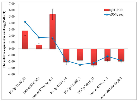 To confirm the expression of sRNAs identified by deep sequencing, eight sRNAs (lengths of 19–25 nt) were randomly selected for quantitative real-time RT-PCR (qRT-PCR) analysis, and these contained three miRNAs (PC-3p-33282_23, zma-miR169l-5p, and zma-miR395a-5p_R-1) with lengths of 20–22 nt (Supplementary Table S1). The comparison indicated that the expression patterns of Cd-responsive sRNAs from high-throughput sequencing and qRT-qPCR exhibited a good concordance (Figure 1, Supplementary Table S1), implying the reliability of the sRNA-seq profiling data for the following analysis.