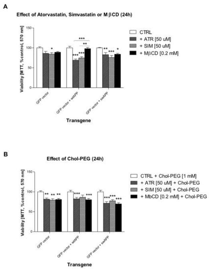 Atorvastatin (50 μM, ATR), simvastatin (50 μM, SIM) or methyl-β-cyclodextrin (0.2 mM, MβCD) were used in one-day treatment (24 h) in PC-12 neuronal cells with AβPP-wt, AβPP-sw or mock-transfected cells. This experiment demonstrated higher susceptibility (lower cell viability) of AβPP-wt transfected cells to HMGCR inhibitors, but not to MβCD when compared to non-treated control cells (p < 0.001, Figure 1A). Additionally, AβPP-sw gene rendered PC-12 neuronal cells highly vulnerable to any statin or MβCD (p < 0.05–0.001, Figure 1A). To reverse the effects of ATR, SIM or MβCD, which caused cholesterol depletion, water soluble cholesterol (1 mM, Chol-PEG) was co-administered. The protective effect of Chol-PEG was hardly observed, it does evenly strengthen MβCD-induced loss in cell viability with regard to non-treated control cells (p < 0.001, Figure 1B).