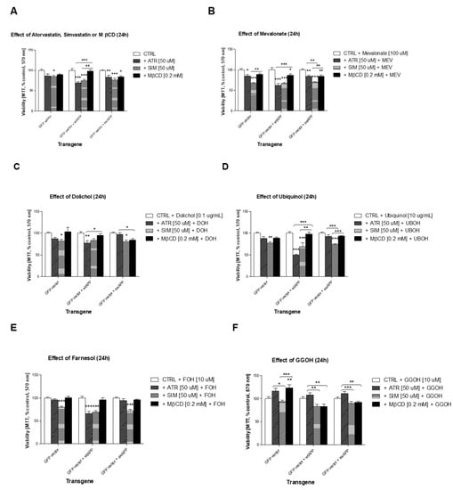 As a matter of fact, we decided to test if MEV pathway intermediates could prevent ATR-, SIM- or MβCD-retarded cell viability. Cell viability was used as an index to evaluate cytoprotective/cytotoxic attributes of particular substance. Prosurvival activity was demonstrated for GGOH when this non-sterol isoprenoid was added to ATR-, SIM- or MβCD-treated cells irrespective of inserted gene (Figure 2). Noticeably, GGOH prevented ATR cytotoxicity better than in SIM or MβCD treatments (Figure 2, p < 0.01–0.001), showing that protein prenylation with geranylgeraniol might be more impaired by ATR than SIM. Actually, several studies highlight the physiological significance of geranylgeranylation catalyzed by two types of enzymes (GGTase-I liable for monogeranylgeranylation, and GGTase-II that catalyzes digeranylgeranylation of sGTPases) [,]. The aforementioned effect of GGOH in PC-12 neuronal cells looks a lot like that described by us recently in C2C12 mouse myoblasts []. Neuronal survival is diminished by statins; moreover, statin effect is independent of reduced cholesterol level, since neuronal viability is restored by FPP/GGPP supplementation, and not by adding cholesterol []. Importantly, the long-term potentiation (LTP) known as long-lasting strengthening of synapses between nerve cells could be blocked with statins []. As a result, long-term memories are fully dependent on the MEV pathway and geranylgeraniol, but cholesterol is not able to reverse the LTP blockade []. For more details about links between the MEV pathway and AD see the papers [,,,]. In a similar way to our cell viability study, GGOH-dependent prenylation was demonstrated to increase neuronal dendritic outgrowth and dendritic protrusion density, as well as increased synaptic proteins in crude synaptosomal fractions []. By all means, the MEV pathway with GGOH preserve neuronal functions because prenylation of some sGTPases mediated by GGTase-I seems to maintain cognitive functions []. Since incubation with FOH alike GGOH prevented ATR-induced toxicity (Figure 2E) we admit FOH could contribute to GGOH production. It is plausible to expect FOH in the non-sterol pathway as the GGOH synthesis in neurons is favored over squalene []. Additionally, examination of gene expression patterns points to lower activity of the pre-squalene pathway in neurons [], which favors the non-sterol MEV pathway, giving rise to FPP, GGPP, ubiquinone, dolichol or heme A. Altogether, these data and recalled reports advocate boosted non-sterol branch of the MEV pathway in neurons, probably owing to the prenylation of sGTPases []. In muscle cells we found that sGTPase RAP1 is a good candidate to control cell viability during myogenesis from C2C12 mouse myoblasts []. It should be pointed out that regardless of a possible shutdown, the branch of squalene synthesis remains vital to neurons, as plasma membrane nanodomains (lipid rafts, LR) with its cholesterol and sphingolipids control cell signaling and protein processing [].
