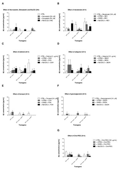 Effect of mevalonate (MEV, 100 μM), dolichol (DOH, 0.1 μg/mL), ubiquinol (UBOH, 10 μg/mL), farnesol (FOH, 10 μM), geranylgeraniol (GGOH, 10 μM) or water soluble cholesterol (Chol-PEG, 1 mM) on amyloid-β (Aβ40) secretion by neurnal PC-12 cells affected by MEV pathway modulators (atorvastatin – ATR, simvastatin – SIM, 50 μM each) or cholesterol chelator methyl-β-cyclodextrin (MβCD, 0.2 mM). Concentration of Aβ1–40 was determined by homogenous time resolved fluorescence (HTRF) assay (CisBio) according to the manufacturer’s instructions as described in the Materials & Methods section. Subsequent figures (A–G) represent Aβ concentration in culture media collected and determined after experiment was completed and corrected for cell viability.