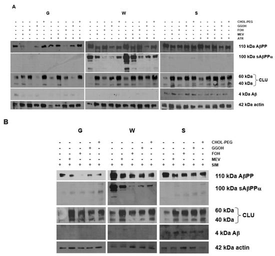 Effect of mevalonate (MEV, 100 μM), farnesol (FOH, 10 μM), geranylgeraniol (GGOH, 10 μM) or water soluble cholesterol (Chol-PEG, 1 mM) on selected protein expressions in cells affected by MEV pathway modulators (A for atorvastatin – ATR, B for simvastatin – SIM). Western blot analysis of proteins: amyloid precursor protein (AβPP, 110 kDa), soluble amyloid protein precursor alpha (sAβPPα, 100 kDa), clusterin (CLU, 60 and 40 kDa), amyloid-β 1-16 (Aβ, 4 kDa), actin (42 kDa) as house-keeping protein in empty vector (G), AβPP wild type gene (AβPP-wt, W), and AβPP Swedish mutations gene (AβPP-sw, S) transfected cells. The results are indicative of three independent experiments with similar results.