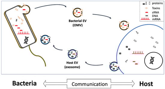 Our group has also recently shown that periodontal pathogens produce miRNA-sized sRNAs (msRNAs) that can be secreted in OMVs, and thereby spontaneously transferred into eukaryotic cells. Moreover, we also demonstrated that the ectopic expression of highly expressed periodontal-pathogen msRNAs in T lymphocytes induced the production of cytokines, such as interleukin (IL)-5, IL-13, and IL-15 []. Similarly, another study showed that Pseudomonas aeruginosa-derived methionine tRNA can be transferred in OMVs into human epithelial airway cells, and thereby reduce their secretion of IL-8 []. Finally, an aggressive fungal pathogen, Botrytis cinereal, has been shown to harbor virulent sRNAs that bind the RISC to inhibit host-immunity genes []. Together, these results suggest that microbial msRNAs may act as communication molecules to mediate bacteria–host interactions. Similarly, animal parasites are also known to produce EV-contained circulating miRNAs and/or sRNAs in their hosts [], some of which have been shown to modulate hosts’ innate immunity [].