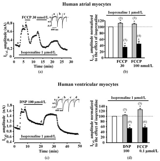 The next series of experiments were set to determine the effect of metabolic inhibition on ICaL in human ventricular myocytes. The ventricular myocytes for these series of experiments were derived from eight patients. We performed experiments in human ventricle myocytes, applying metabolic inhibitors FCCP and 2,4-Dinitrophenol (DNP) on ISO (1 μmol/L) stimulated cells. We found that FCCP induced a rapid initial stimulation of ICaL in three out of six ventricular myocytes (five patients). Further, 100 nmol/L of FCCP increased ISO-stimulated ICaL by 24.8 ± 5.3% (n = 3, p < 0.05). The reduction of ICaL induced by FCCP was registered in all tested cells, i.e., ICaL was reduced by 42.5 ± 3.5% (n = 6, p < 0.05). Another uncoupler, DNP, also evoked a transient increase of ISO-stimulated ICaL in five ventricular myocytes from nine (three patients). Further, 100 µmol/L of DNP increased ISO-stimulated ICaL by 5.0 ± 0.9% (n = 5, p < 0.05). The reduction of ICaL by 44.8 ± 4.4% induced by DNP was registered in all (n = 9, p < 0.05) human ventricular myocytes (Figure 1c,d). The initial stimulation of ICaL induced by uncouplers FCCP and DNP was recorded in eight out of 15 (~53%) tested human ventricular myocytes.