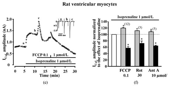 To confirm that the effects of uncouplers on ICaL were due to metabolic inhibition, effects of other metabolic inhibitors were also tested. Rotenone (30 µmol/L), an inhibitor of the complex I of the mitochondrial respiratory chain, also caused an initial increase of ISO-stimulated ICaL by 11.4 ± 0.2% (n = 3, p < 0.05, 2 animals) and later reduced ICaL by 28.2 ± 7.6% (n = 3, p < 0.05). Antimycin A (10 µmol/L), an inhibitor of the complex III of the mitochondrial respiratory chain, initially increased ISO stimulated ICaL by 8.3 ± 2.3% (n = 5, p < 0.05) and decreased by 35.5 ± 1.9% (n = 5, p < 0.05, 3 animals, Figure 1f, Supplementary Figure S1). The initial transient stimulation of ICaL was recorded in all tested rat cardiomyocytes during the early phase of metabolic inhibition regardless of the metabolic inhibitor used. The effects of metabolic inhibitors in cardiac cells are summarized in Supplementary Table S1.