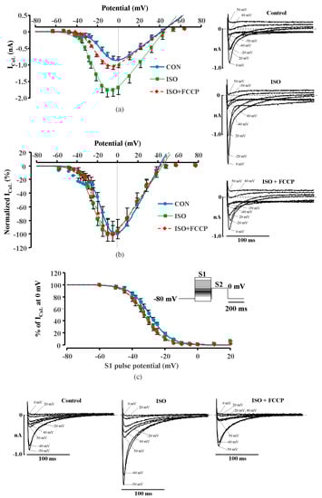 Current–voltage relationship and inactivation of ICaL in rat ventricular cells. (a) Current–voltage (I–V) relationship, (b) normalized I–V relationship. Insets on the right: I–V measurements (representative of traces of ICaL registered during S1 in control, in ISO stimulated cell and in the presence of FCCP). (c) Inactivation curves of ICaL under basal conditions, during ISO (1 μmol/L) stimulation and during exposure to FCCP (100 nmol/L) in the presence of ISO in rat ventricular cells. Inset: Double-pulse protocol used for the inactivation curves (see Methods for details). ICaL peak amplitude during S2 pulse is expressed as a percentage of ICaL measured at 0 mV without conditioning pulse S1 and plotted as a function of S1 pulse potential. Points represent experimentally measured values; lines represent values calculated with Boltzmann equation. Insets below: Inactivation of ICaL (representative traces of ICaL registered during S2 in control, in ISO stimulated cell and in the presence of FCCP).