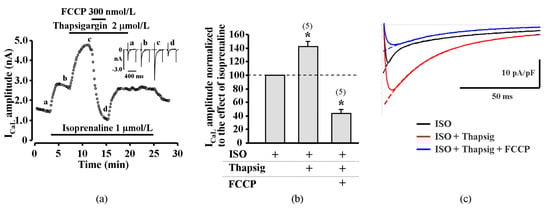 Effect of FCCP on isoprenaline stimulated ICaL in rat cardiomyocytes after the suppression of cytosolic Ca2+ release. (a) A typical experiment representing the effect of FCCP on ICaL in ISO-stimulated cells during exposure to thapsigargin. Traces of ICaL shown in the panel were recorded at the times indicated by the corresponding letters on the main graph. (b) Peak amplitude of ICaL during exposure of ISO-stimulated rat ventricular cells to FCCP in the presence of thapsigargin. Values are presented as means ± SEM for the number of cells indicated in parentheses. * p < 0.05 versus ISO alone. (c) The time dependent inactivation of LTCCs currents. Traces of ICaL in isoprenaline (ISO, 1 µmol/L) stimulated (black line) rat cell during application of thapsigargin (Thapsig, 2 µmol/L) (red line) and metabolic inhibition by FCCP (0.1 µmol/L) (blue line). Dashed lines represent double exponential fits of ICaLs decay.