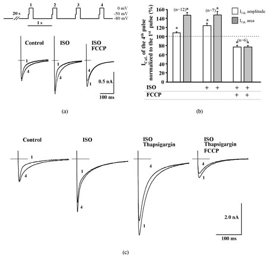 The results obtained with thapsigargin and ryanodine in rat ventricular cells point to a possible role of CDI in the ICaL increase during the early phase of metabolic inhibition. To further confirm this hypothesis, we measured the changes of ICaL facilitation in rat cardiac cells in the absence and presence of FCCP. Increased frequency (to 1 Hz) of depolarization after a 20 s pause was used in these series of experiments. The peak amplitude of ICaL and the ICaL area were compared at the time of the first and fourth depolarizing pulse. In control conditions, increased stimulation frequency enhanced ICaL amplitude by 8.3 ± 2.1% and the area by 46.9 ± 6.3% (n = 12, p < 0.05) during the fourth depolarizing pulse. In ISO stimulated rat cardiac cells, increasing stimulation frequency to 1 Hz also induced ICaL facilitation and increased ICaL peak amplitude and area by 22.2 ± 5.3% and 42.0 ± 8.6% (n = 7, p < 0.05), respectively (Figure 4a,b). Double exponential fits of ICaL decay during the first and fourth depolarizing pulses revealed that the time constant of the fast component τ1 increased from 5.8 ± 0.5 ms to 7.3 ± 0.7 ms (n = 8, p < 0.01), while the time constant of the slow component τ2 decreased from 62.1 ± 4.8 ms to 51.3 ± 2.6 ms (n = 8, p < 0.01). The ICaL curves are presented in Supplementary Figure S4. After treatment of rat ventricular myocytes with FCCP, ICaL facilitation was no longer observed and ICaL amplitude and area were reduced by 23.6 ± 4.1% and 23.1 ± 3.3% (n = 6, p < 0.05, Figure 4a,b) during the fourth depolarizing pulse, respectively.