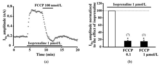 While ICaL suppression during metabolic inhibition was previously demonstrated by numerous studies [,,,], the transient increase in ICaL amplitude during metabolic inhibition in cardiac myocytes has not previously been reported. To determine if this phenomenon is specific to human cardiomyocytes, we reproduced the same type of experiments in rat ventricular myocytes. Application of FCCP (100 nmol/L) in ISO-stimulated cells induced a transient increase in ICaL by 20.2 ± 2.7% (n = 12, p < 0.05, four animals) that was followed by ICaL reduction by 42.4 ± 4.6% (n = 12, p < 0.05) (Figure 1e,f). Higher concentrations of FCCP like 300 nmol/L (not shown) and 1 μmol/L (Figure 1e) also induced a biphasic effect in rat ventricular myocytes.