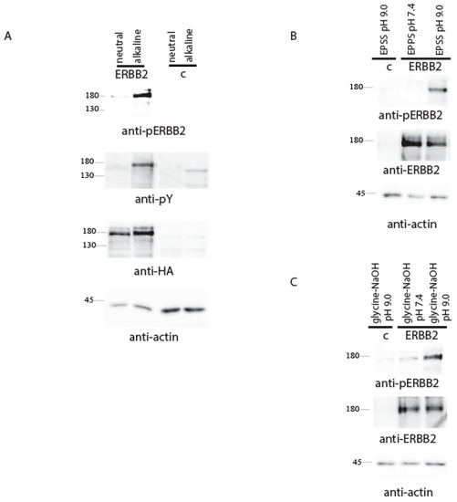 (A) HEK293 cells were transfected with a HA-tagged ErbB2-coding construct. At 36 h after transfection, the cells were incubated in PBS at pH 7.4 or 9.0 adjusted by 60 mM Tris-HCl for 10 min. Then, the cells were lysed and analyzed by Western blotting with the indicated antibodies. Control cells are untransfected cells. (B) HEK293 cells were transfected with HA-tagged ErbB2-coding construct and then incubated in PBS solution at pH 7.4 or 9.0 adjusted by 60 mM EPPS buffer with the same pH for 10 min. The cells were lysed and blotted with the indicated antibodies. (C) HEK293 cells were transfected with HA-tagged ErbB2-coding construct and then incubated in PBS solution at pH 7.4 or 9.0 adjusted by 60 mM glycine–NaOH buffer with the same pH for 10 min. The cells were lysed and blotted with the indicated antibodies.