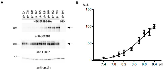 (A) pH-dependence of ErbB2 activation by alkaline media. HEK293 cells were transfected with the HA-tagged ErbB2 coding construct. At 36 h after transfection, the cells were incubated in PBS with the indicated pH adjusted by Tris-HCl, lysed and blotted with anti-phosphoErbB2 (anti-pErbB2), anti-ErbB2, and anti-actin antibodies. (B) Quantitative analysis of four independent experiments. Phosphorylation signals from Western blots were quantified and normalized according to the anti-ErbB2 signals. Normalized signals were plotted vs. pH of the tested solutions. Values are means ± SE (n = 4).