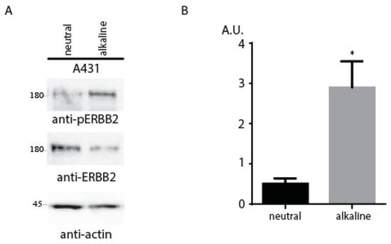 Finally, we tested the pH-sensing property of the endogenously present ErbB2 receptor in A431 cell lines with a physiologically relevant level of ErbB2 expression. These cells were incubated in Tris-buffered physiological saline solutions at pH 7.4 or 8.6. The cells were further lysed and blotted with anti-ErbB2 antibody or anti-phosphoErbB2 antibody (Figure 3A). The quantitative analysis of ErbB2 receptor phosphorylation showed statistically significant ErbB2 activation in A431 cells by the alkali medium (Figure 3B).