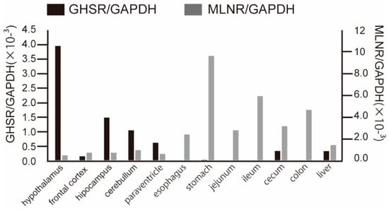 RNA was isolated using RNeasy Plus Universal Kits (QIAGEN, Hulsterweg, Netherlands). RNAs were converted into cDNAs using a High-Capacity cDNA Reverse Transcription Kit (Thermo Fisher Scientific, Waltham, MA, USA). cDNA products were quantified by real-time PCR using Light Cycler SYBR Green (Roche, Basel, Switzerland) and a Light Cycler®480 (Roche, Basel, Switzerland), with the gene encoding glyceraldehydes-3-phosphate dehydrogenase (GAPDH) as an internal control. The forward and reverse mouse GAPDH primers were 5′-TGCACCACCAACTGCTTA-3′ and 5′-GGATGCAGGGATGATGTT-3′, respectively, which should yield a 177-bp product. The forward and reverse human MLNR primers were 5′-TCCTCTACAACCTCATTTCA-3′ and 5′-TTATCCCATCGTCTTCAC-3′, respectively, which should yield a 182-bp product. The forward and reverse mouse GHSR primers were 5′-GACCAGAACCACAAACAGACAG-3′ and 5′-GGCTCGAAAGACTTGGAAAA-3′, respectively, which should yield a 113-bp product. The forward and reverse mouse ghrelin primers were 5′-TCCTCTGGGAAGAGGTCAAA-3′ and 5′-CTGAGGCGGATGTGAGTTC -3′, respectively, which should yield a 103-bp product.