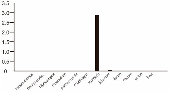 The human MLNR cDNA was incorporated into a transgene designed to direct ubiquitous expression in mouse. Mouse GHSR was expressed natively. MLNR and GHSR mRNA levels were evaluated by real-time reverse transcriptase PCR (RT-PCR) (Figure 1). MLNR mRNA was expressed primarily in the gastrointestinal tracts, but also was present ubiquitously in brain and liver. In contrast, GHSR mRNA was expressed primarily in the brain (mostly in the hypothalamus); low expression was observed in the gastrointestinal tract. We also examined the expression of ghrelin mRNA, which was most strongly expressed in the stomach (Figure 2) and is consistent with past reports []. Thus, the expression pattern of MLNR and GHSR in Tg mouse was similar to that in human.