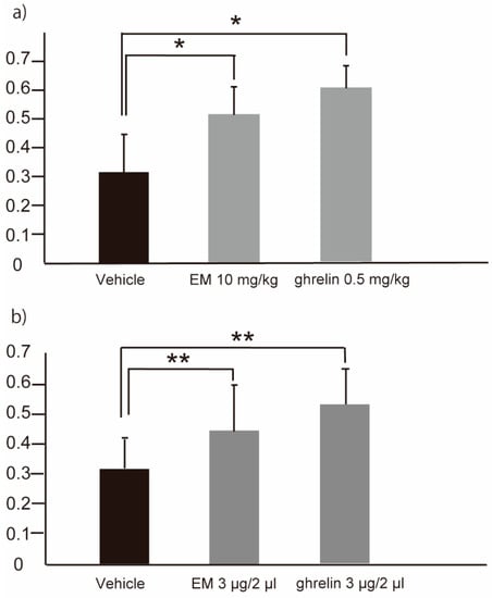 We next tested the effects of EM administered by either the central (intracerebroventricular (icv); 3 µg EM in a 2 µL volume) or peripheral (intraperitoneal (ip); 10 mg/kg) route, and of ghrelin administered by the same routes (3 µg/2 µL and 0.5 mg/kg, respectively). The GE of a carboxymethyl cellulose/phenol red dye non-nutrient meal was significantly faster in mice administered peripherally with EM (0.51 ± 0.10 (mean ± SD), n = 6) or ghrelin (0.60 ± 0.08, n = 3) compared to that in animals dosed ip with vehicle (0.31 ± 0.13, n = 10) (p < 0.05) (Figure 3a). Similarly, GE was significantly faster in mice administered centrally with EM (0.44 ± 0.15, n = 14) or ghrelin (0.52 ± 0.11, n = 9) compared to animals dosed icv with vehicle (0.32 ± 0.10, n = 16) (p < 0.01) (Figure 3b).