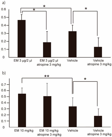 While GE was induced by centrally administered EM, this effect was attenuated by co-administration of atropine (Atr; 3 mg/kg). Specifically, central administration of EM only, EM + Atr, vehicle only, and vehicle + Atr yielded GE values of 0.47 ± 0.07, 0.19 ± 0.13, 0.33 ± 0.08, and 0.13 ± 0.11 (n ≥ 3), respectively (Figure 4a). In contrast, co-administration of Atr did not affect GE induced by peripherally administered EM, with peripheral administration of EM only, EM + Atr, vehicle only, and vehicle + Atr yielding GE values of 0.55 ± 0.10, 0.50 ± 0.22, 0.34 ± 0.14, and 0.18 ± 0.12 (n ≥ 7), respectively (Figure 4b). Previous work has shown that EM’s effect on the contractile response in the stomach of Tg mice reflects direct action via MLNR []. We therefore concluded that EM promotes GE both through the vagus nerve system and by direct action on MLNR.