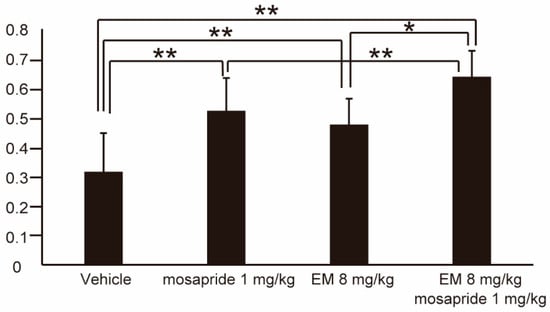 We investigated whether EM could also promote additional GE. EM (8 mg/kg) and mosapride (1 mg/kg) were co-administered by the ip route. Dosing of the mice with vehicle only, mosapride only, EM, and mosapride + EM yielded GE values of 0.32 ± 0.13, 0.52 ± 0.11, 0.48 ± 0.09, and 0.64 ± 0.09 (n ≥ 8), respectively (Figure 5). We therefore concluded that the effect of EM is additive with that of mosapride.