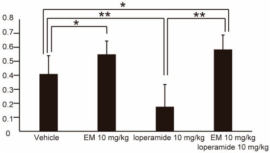 We examined the potential utility of EM in enhancing gastroparesis induced by loperamide. EM (10 mg/kg) and loperamide (10 mg/kg) were co-administered by the ip route. Dosing of the mice with vehicle only, EM only, loperamide only, and loperamide + EM yielded GE values of 0.41 ± 0.13, 0.55 ± 0.10, 0.18 ± 0.16, and 0.58 ± 0.10 (n ≥ 6), respectively (Figure 6). We therefore concluded that EM improves loperamide-induced gastroparesis.