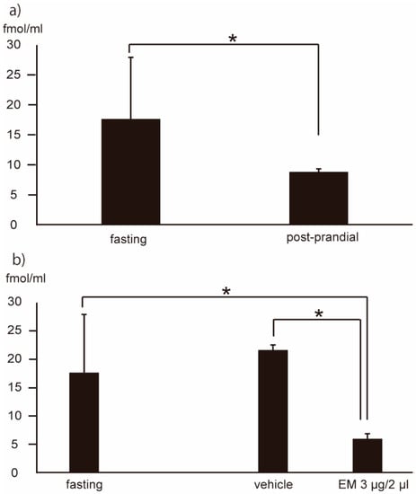 The plasma level of acyl-ghrelin was investigated in Tg mice administered centrally with EM. Plasma samples were collected at 1 h after administration by the icv route. Acyl-ghrelin was detected at 17.65 ± 10.25 fmol/mL (n = 6) in fasting-group mice, and at 21.62 ± 0.92 fmol/mL (n = 3) and 5.95 ± 0.90 fmol/mL (n = 4) at 1 h after dosing with vehicle or EM, respectively (Figure 7b). Thus, acyl-ghrelin level was significantly (p < 0.05) attenuated in animals administered with EM by the central route.