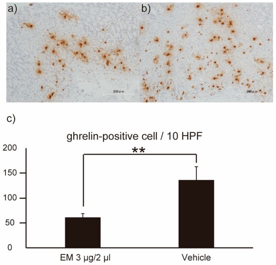 Immunohistochemical staining for ghrelin expression in the stomachs of mice. Representative micrographs are provided showing the distribution of ghrelin-positive cells (brown staining) in the stomachs of mice administered EM (a) or vehicle (b). The numbers of ghrelin-positive cells/10 high power field (HPF) were quantified in stomachs from n = 5 mice (c). Values represent the mean ± SD for the indicated number of animals. ** p < 0.01 (Unpaired Student’s t-test).