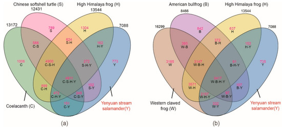 Gene family clustering among the six vertebrates: (a) The clustering state among coelacanth, Chinese softshell turtle, High Himalaya frog, and Yenyuan stream salamander; (b) The clustering state among Western clawed frog, American bullfrog, High Himalaya frog, and Yenyuan stream salamander.
