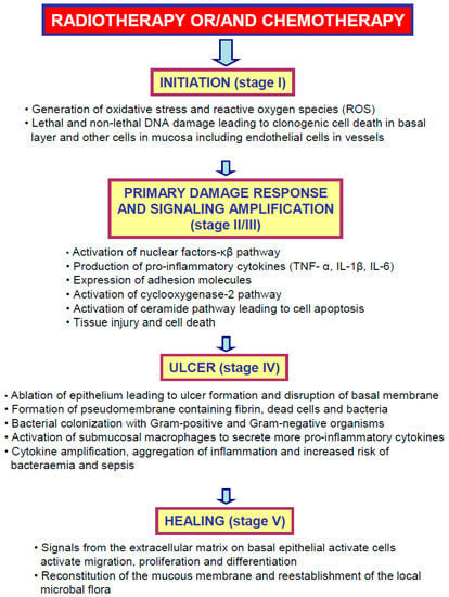 Chemo- and radiotherapy should only target neoplastic cells; however, these therapies also exhibit an antimitotic effect on the rapidly dividing progenitor cells in different parts of the body. In the past, it was believed that oral mucositis is solely the result of the nonspecific damaging effect of chemo- or/and radiotherapy on rapidly dividing cells in the basal layer of the oral mucosa [,]. Currently, it was shown that the pathogenesis of oral mucositis is not so direct and simple [,,]. Reactive oxygen species, pro-inflammatory pathways and metabolic bioproducts of colonizing microorganisms are believed to play a role in amplifying the tissue injury []. At the beginning of the 21st century, Sonis et al. [,] proposed a five-stage model for the development and healing of oral mucositis: (1) initiation; (2) upregulation and generation of messenger signals; (3) signaling and amplification; (4) ulceration with inflammation; and (5) healing (Figure 1).