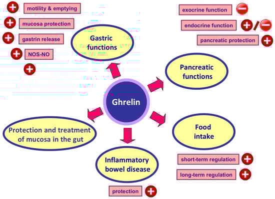 Numerous animal studies have demonstrated that exogenous ghrelin exhibits a protective effect in several organs such as the heart [], kidney [] and brain [] against ischemic injury, as well as reduces the severity of sepsis-induced lung injury and mortality []. Moreover, ghrelin exhibits therapeutic effects in different experimental models of inflammation or tissue damage, among others, in autoimmune encephalomyelitis [], nerve regeneration [] and wounds evoked by a combination of radiation plus burns []. In the gut, protective and therapeutic effect of ghrelin administration has been shown, among others, in the stomach, duodenum and colon (Figure 2). Pretreatment with ghrelin protects gastric mucosa against damage evoked by ethanol [], stress [] or alendronate []. A beneficial effect of ghrelin administration has been also shown in the treatment of experimental ulcers in different organs. Treatment with ghrelin accelerates the healing of gastric, duodenal and oral ulcers evoked by acetic acid, ethanol or cysteamine [,,]. The healing-promoting effect of ghrelin in these ulcers has been associated with the recovery of adequate mucosal blood flow and an improvement of the mucosal cell vitality and proliferation, an increase in antioxidant defense, as well as a reduction in the mucosal oxidative stress and inflammatory response. Moreover, Wu et al. [] have shown that the level of endogenous ghrelin is significantly reduced after an ischemia/reperfusion (I/R)-induced intestinal injury. The administration of exogenous ghrelin inhibits pro-inflammatory cytokine release, reduces neutrophil infiltration in the intestine and lung, ameliorates intestinal barrier dysfunction, attenuates intestinal and pulmonary injury and improves the survival of rats after ischemia/reperfusion-induced intestinal injury [].