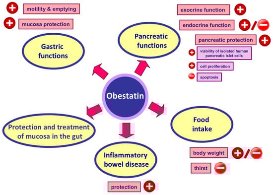 Mechanisms of protective and therapeutic effects of obestatin involve, among others, the improvement of blood flow in exposed to damaging factor organs, the amelioration of cell vitality and cell proliferation, a reduction of the expression and presence of pro-inflammatory IL1-β and TNF-α, a decrease in leukocytosis and tissue activity of myeloperoxidase [,], the limitation of malondialdehyde (MDA) tissue content and an increased SOD level []. Moreover, obestatin exhibits an antiapoptotic effect, and the mechanism of this effect involves the activation of PI3K, PKC-epsilon, PKC-delta and ERK1/2 signaling [] and the activation of an NO/soluble guanylate cyclase (sGC)/PKG pathway [].
