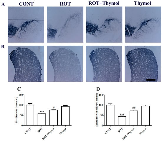 Javed, H.; Azimullah, S.; Meeran, M.N.; Ansari, S.A.; Ojha, S. Neuroprotective Effects of Thymol, a Dietary Monoterpene Against Dopaminergic Neurodegeneration in Rotenone-Induced Rat Model of Parkinson’s Disease. Int. J. Mol. Sci. 2019, 20, 1538. https://doi.org/10.3390/ijms20071538