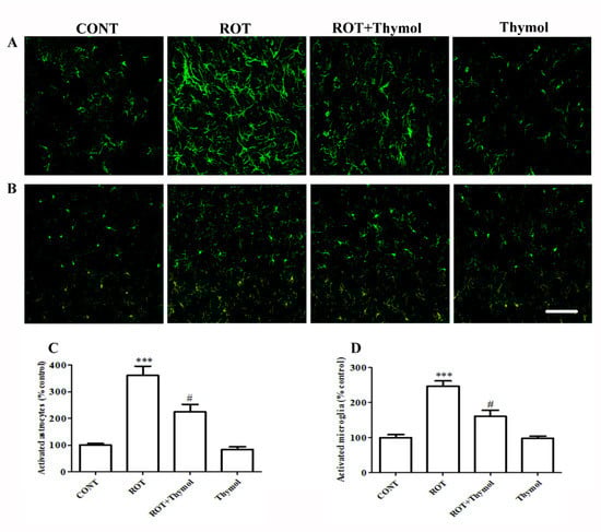 4.11. Determination of Activated Astrocytes and Microglia in the Striatum