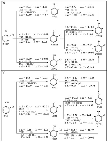 Formation of radical species C(T)PR1, C(T)PR2, C(T)PDR, (T)PR2, and (T)PDR embedded with the potential barriers ΔE (in kcal/mol) and reaction heats ΔH (in kcal/mol) from reactions of 2-CTP (a) and 2-CP (b) with H/OH radicals, respectively. ΔH is calculated at 0 K.