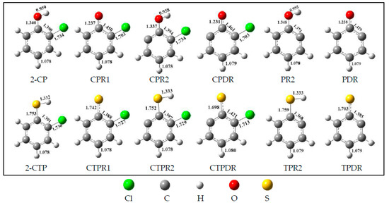 The formation of 2-chlorothiophenoxy (CTPR1), 2-sulfydryl-3-chloro-phenyl (CTPR2), chlorinated thiophenoxyl diradical (CTPDR), 2-sulfydrylphenyl radical (TPR2), and thiophenoxyl diradical (TPDR) derived from 2-chlorothiophenol (2-CTP), and the formation of 2-chlorophenoxy (CPR1), 2-hydroxyl-3-chloro-phenyl (CPR2), chlorinated phenoxyl diradical (CPDR), 2-hydroxylphenyl radical (PR2), and phenoxyl diradical (PDR) derived from 2-chlorophenol (2-CP) are the initial and key steps in the radical/molecule formation of PCTA/PT/DT/DFs. In combustion and thermal processes, these radicals may be generated by means of H or Cl extraction reactions of 2-C(T)P by the active radicals H, OH, Cl, or O(3P) which exist abundantly in high-temperature conditions. The potential barriers (ΔE) and the reaction heat (ΔH) which are calculated at the MPWB1K/6-311+G(3df,2p)//MPWB1K/6-31+G(d,p) level for the formation of C(T)PR1, C(T)PR2, C(T)PDR, (T)PR2, and (T)PDR from 2-C(T)P abstracted by the H and OH are given in the Figure 1a,b. In Figure 1, data of sulfydryl/hydroxyl-H abstraction of 2-C(T)P by H and OH are cited from our previous studies at the MPWB1K/6-311+G(3df,2p)//MPWB1K/6-31+G(d,p) level [44,45,46]. Pan et al. and Yu et al. also studied the formation of C(T)PR1, C(T)PR2, C(T)PDR, (T)PR2, and (T)PDR from 2-C(T)P molecules abstracted by H radical at the BB1K/6-311+G(3df,2p)//BB1K/6-311G(d,p) level [27,41]. Similar abstraction reactions by OH radical are added in this study. Notably, our value at the MPWB1K/6-311+G(3df,2p)//MPWB1K/6-31+G(d,p) level match well with Pan and Yu’s data at the BB1K/6-311+G(3df,2p)//BB1K/6-311G(d,p) level, and the maximum relative error remains within 1.03 kcal/mol for potential barriers (ΔE) and less than 0.90 kcal/mol for reaction heats (ΔH). Based on these results, the same level of can be expected for other species involved in this study. As can be seen in Figure 1, the chlorinated phenoxy/thiophenoxy radicals C(T)PR1 arises from cleavage of sulfydryl S-H bond or hydroxyl O-H bond from the precursor 2-C(T)P. Moreover, the sulfydryl-substituted/hydroxyl-substituted phenyl radicals (T)PR2 and C(T)PR2 arise from the dissociation of the Cl or H atom combined to the carbon in the adjacent position of the carbon with the sulfydryl/hydroxyl group. Additionally, the phenoxyl/thiophenoxyl diradicals (T)PDR and C(T)PDR arise from the loss of both of the sulfydryl-H or hydroxyl-H and the ortho-substituted Cl or H atom. All the optimized geometries for 2-C(T)P and related radicals are shown in Figure 2.