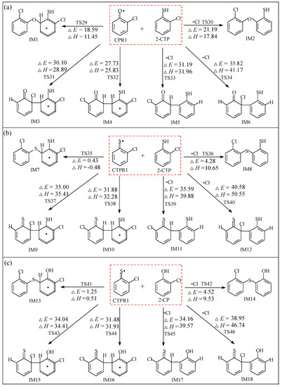 In Figure 3a, the potential barriers involved in O/C coupling modes to form ether-thioenoltype intermediates process are within 18.59–21.19 kcal/mol, which are generally lower than those operating in the C/C coupling modes (27.73–35.82 kcal/mol) to form biphenyl intermediates. In addition, the O/C coupling modes (11.45–17.84 kcal/mol) are less endoergic than the C/C coupling modes (25.83–41.17 kcal/mol). Therefore, the O/C coupling modes to form pre-PCPT intermediates are energetically preferable over the C/C coupling modes to form pre-PCDF intermediates in Figure 3a. Similar conclusion could be obtained in the CPR1+2-CP reactions in Figure S1a of Supplementary Materials [41]. Analogously, the S/C coupling modes to produce pre-PCTA/PT intermediates are energetically preferred to the C/C coupling modes in Figure 3b,c to form pre-PCDT intermediates. In other words, the radical/molecule coupling of C(T)PR1 with 2-C(T)P is difficult to occur in the C/C coupling. The combination reactions of C(T)PR1 with 2-C(T)P tend to take place via the phenoxy oxygen or thiophenoxy sulfur sites and to produce (thio)ether-(thio)enol type intermediates analogues, which proceed via elimination of H, (thio)phenolic H abstraction, ring close, and Cl elimination steps and eventually lead to the formation of PCTA/PTs [41]. To sum up, the ranking of the S/C or O/C coupling to form pre-PCTA/PT/DDs intermediates is as follows: CTPR1 + 2-CTP > CTPR1 + 2-CP >> CPR1 + 2-CP ≈ CPR1 + 2-CTP.
