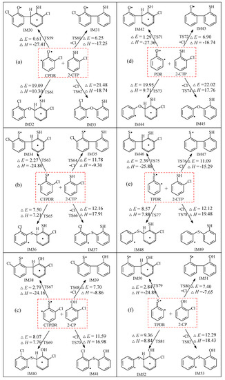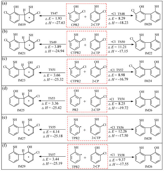 The pre-PCDT/DF formation reaction pathways for cross-couplings of CPR2 and 2-CTP, CTPR2 and 2-CTP, CTPR2 and 2-CP, PR2 and 2-CTP, TPR2 and 2-CTP, and TPR2 and 2-CP embedded with the potential barriers ΔE (in kcal/mol) and reaction heats ΔH (in kcal/mol) are illustrated in Figure 4a–f, respectively. After the ortho-H/Cl abstraction in benzene ring of 2-CP and 2-CTP, they form the extremely high reactive carbon (radcial)-centered hydroxyl(sulfydryl)-substituted phenyl radicals [47,48], C(T)PR2 and (T)PR2, which may attack the 2-C(T)P molecule by two C/C coupling modes to form biphenyl intermediates: (1) The coupling of carbon (radical)-centered radical and carbon (hydrogen)-centered molecule (C•/CH for short), and (2) the coupling of carbon (radical)-centered radical and carbon (chlorine)-centered molecule (C•/CCl for short). The C•/CCl coupling is a synergetic reaction with the Cl elimination occurring at the same time. Six intermediates (IM19, IM21, IM23, IM25, IM27, and IM29) are produced by C•/CH coupling, and five other intermediates (IM20, IM22, IM24, IM26, and IM28) are produced by C•/CCl coupling. All 11 intermediates can result in the formation of PCDT/DFs, which are not the precursors for PCTA/PTs due to the absence of O/S centered radicals in C(T)PR2 and (T)PR2.